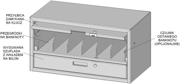 - opcjonalnie: czujnik ostatniego banknotu umożliwiający wzbudzenie „cichego alarmu”